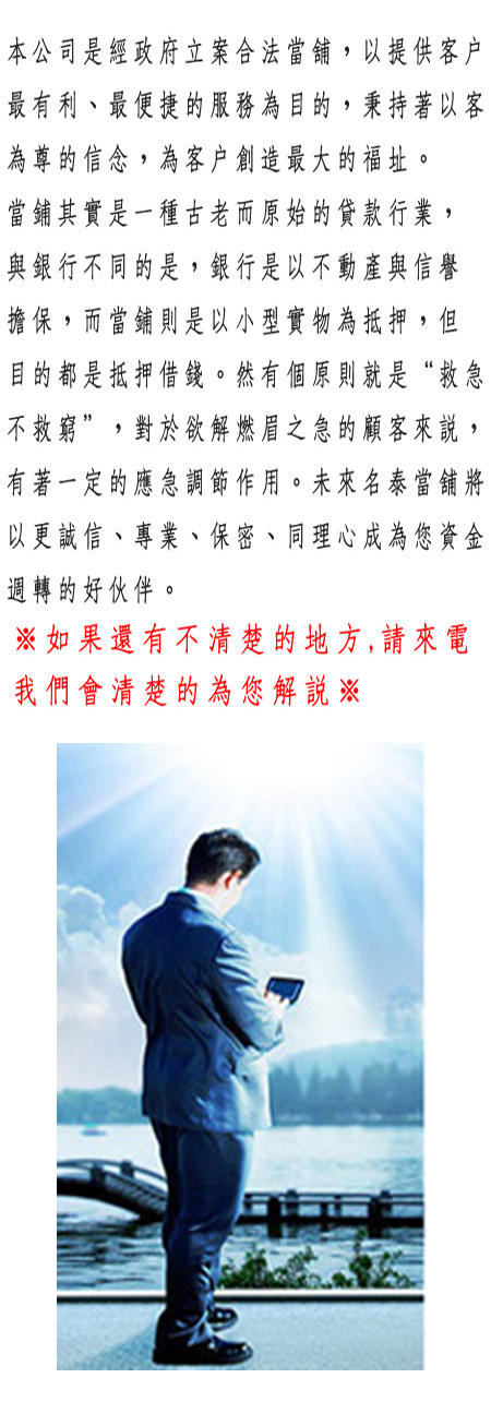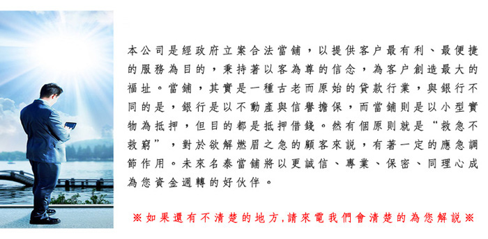 2.黃金、鑽石、名錶、名牌包…等當價高,保管妥善、保密。