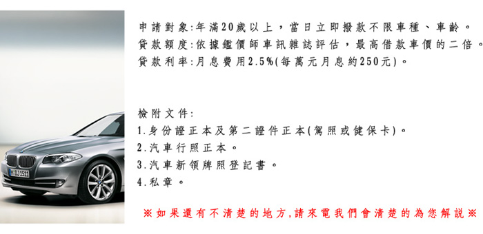 新北市汽車借款不限車種:各式轎車.休旅車.箱型車.大小貨車.車輛有無分期均可借貸,無論車主是個人還是公司皆可辦理,月息2%起,沒有貸款的汽(機)車還可享優惠利率,按日計息,用幾天算幾天,持票擔保可增貸或降息。